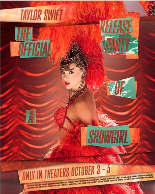 ‘I hereby invite you to a *dazzling* soirée, The Official Release Party of a Showgirl: Oct 3 – Oct 5 only in cinemas!’ she shared via an Instagram post on Friday.
